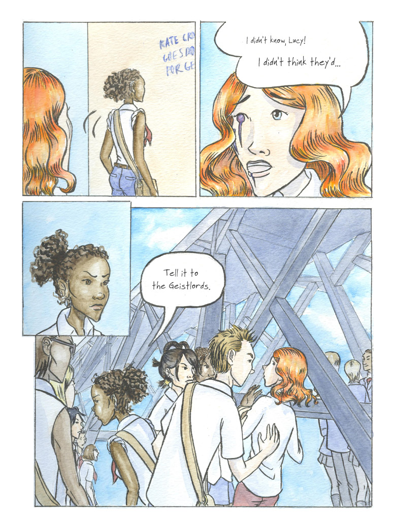 there are many very beautiful panels–I kept being about to comment on the way bars and outside light cast shadows on someone’s clothes inside, or the impressive perspective behind two foregrounded people, or the way you’ve mixed eerie blue with delicate pink, or nailed the skin tone of someone exactly, or or or… but there are too many extremely lovely moments. Please hurry up with more story!!!