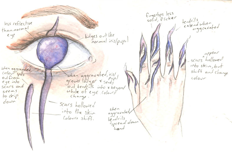 what is her hand? Instead of a written explanation, could you answer that by drawing a detailed picture of her hand (and eye)? This way, if you were planning on intertwining an explanation of her hand (and eye) into the story, you won’t spoil that now.